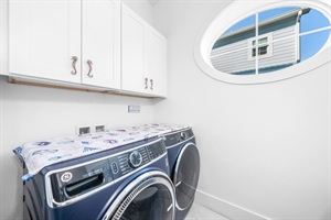Main-floor half-bath doubles as laundry suite! Features a unique designer shell sink and bespoke 18th-century cabinetry and unique seahorse handles. Equipped with premium washer/dryer, iron, and beach towels—convenience meets 30A coastal style.