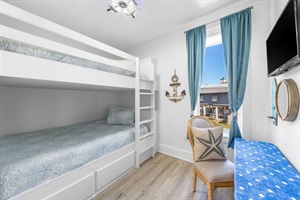 Cozy Queen-over-Queen bunk room sleeps 4 comfortably. Perfect for groups/kids, this nautical-themed retreat features an smart TV and custom color-changing LED lighting. A stylish, space-saving layout designed for the ultimate beach getaway.